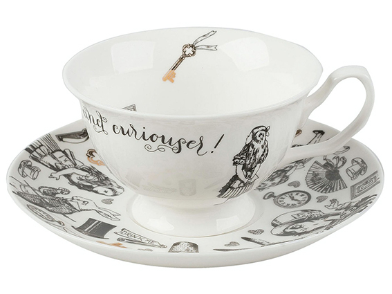 Förtjusande tekopp med fat, i porslin. Koppen och fatet pryds av en scen där Alice deltar i Hattmakarens tebjudning, tryckt i svartvita illustrationer. Motiven är inspirerade av ett Alice i Underlandet-kortspel baserat på konstverk av Sir John Tenniel (1820–1914).