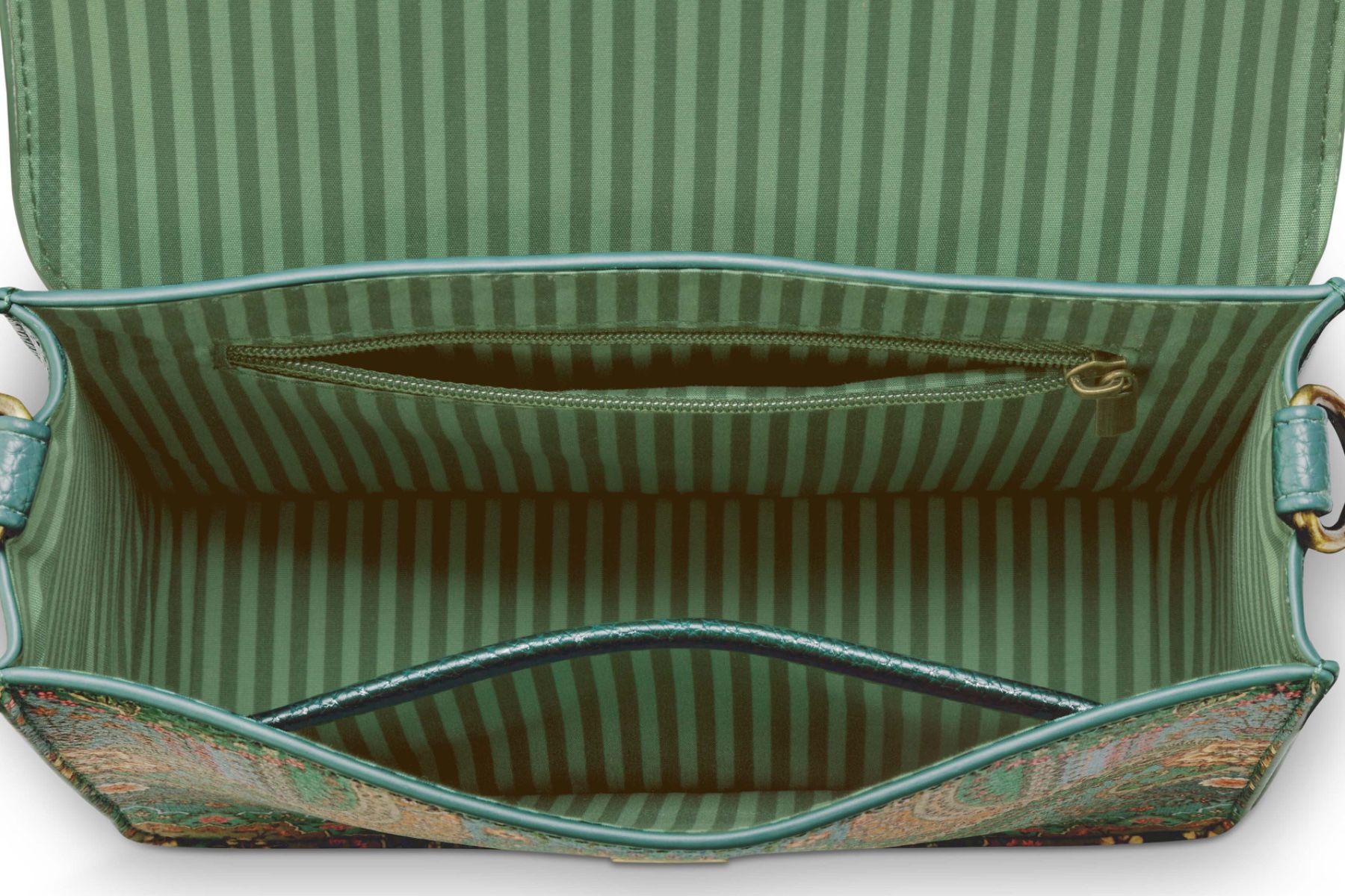 Randig väsa från PIP Studio. i grönt och brunt samt ett justerbart band med broderat blommönster. Ett utvändigt fack samt ett stort och två små fack inuti. Mått är: 25 x 18 x 6,5