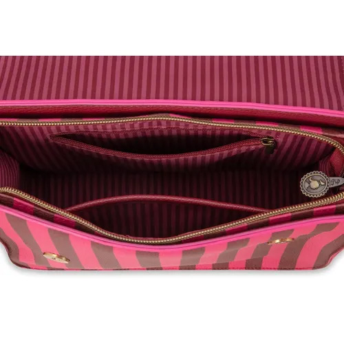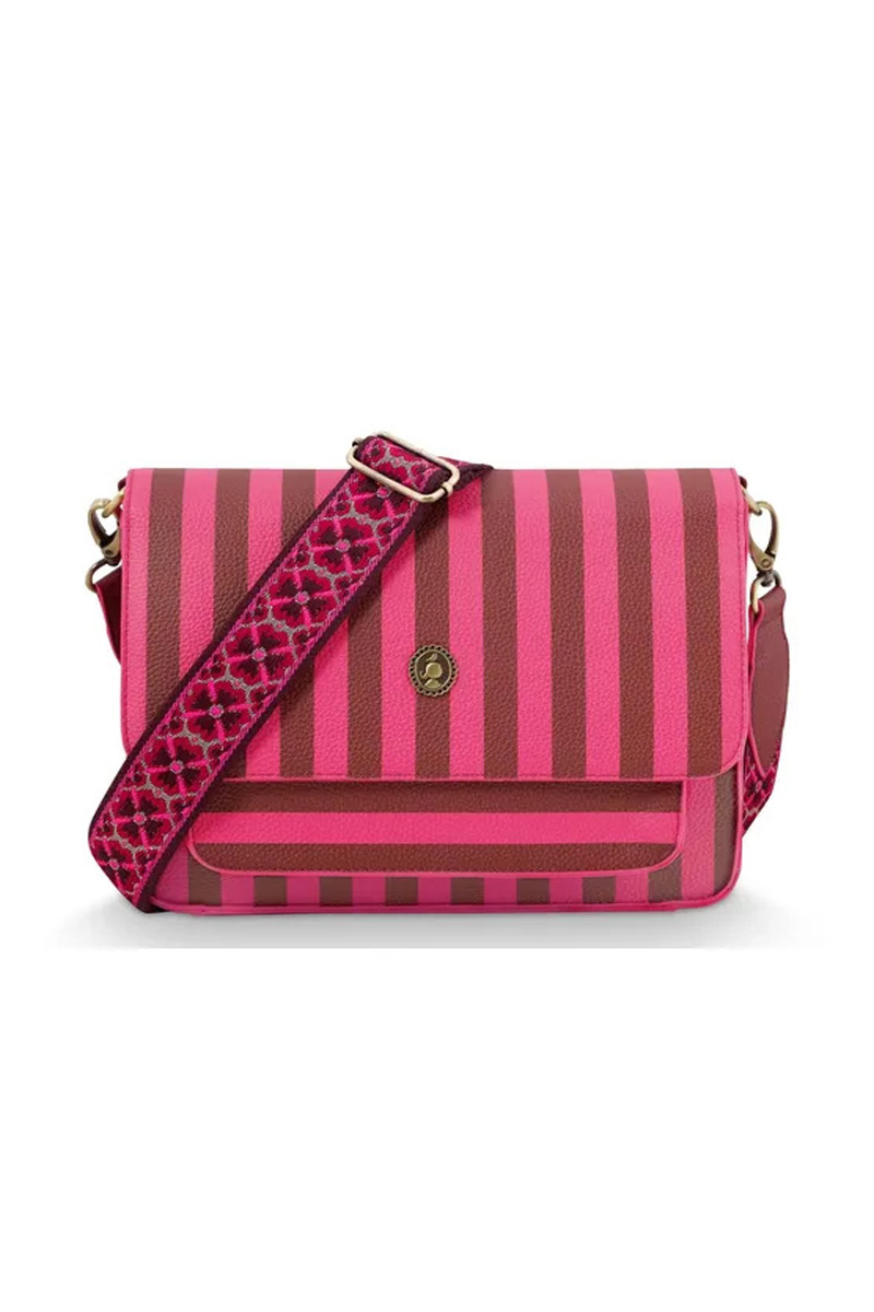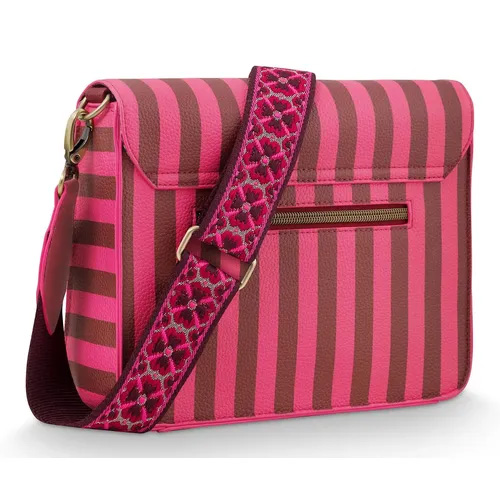 Randig väsa från PIP Studio, i rosa och brunt samt ett justerbart band med broderat blommönster. Ett utvändigt fack samt ett stort och två små fack inuti.