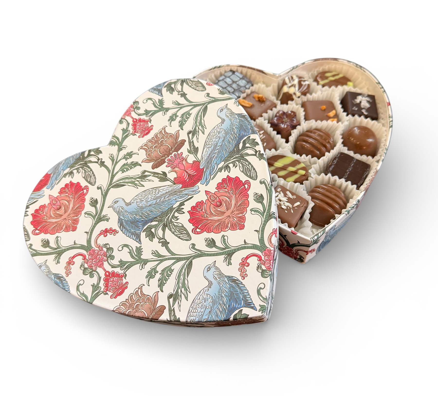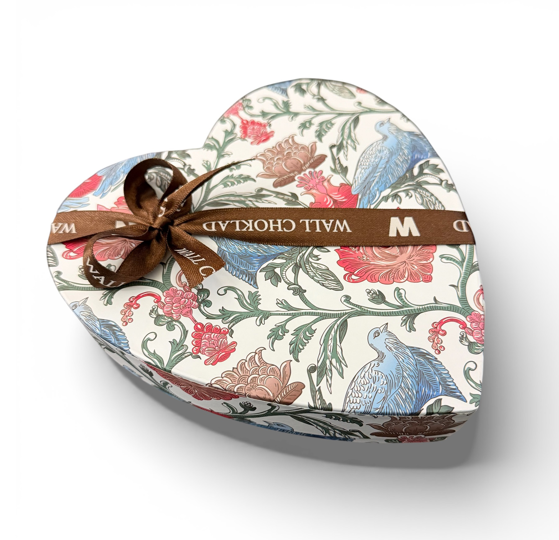 Exklusiv hjärtformad ask med sidenband, innehållande 18 praliner, ca 200g Vilka sorter som ingår i asken kan variera. Hör av dig till oss om du vill veta exakt vilka praliner som ingår just nu.
