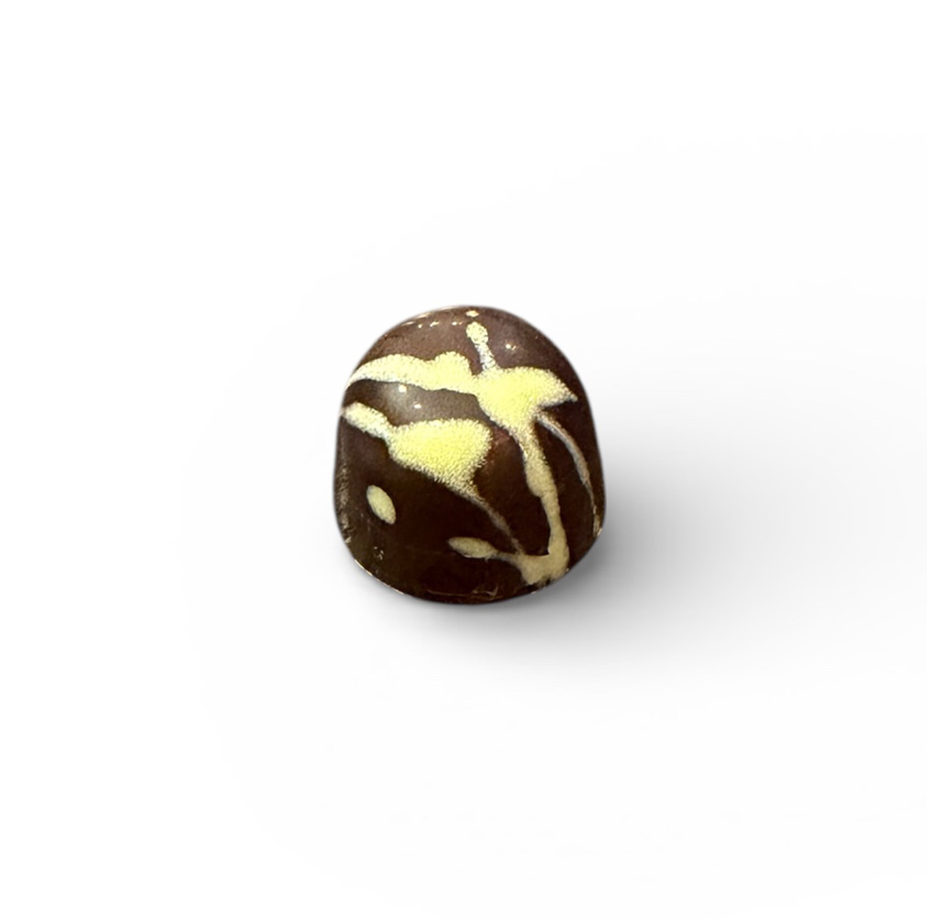 Vit chokladganache med kokos och vit chokladganache med lime, i ett skal av mörk choklad.