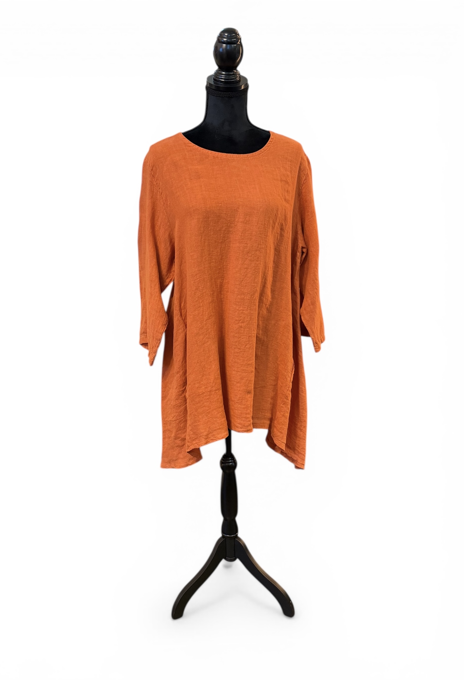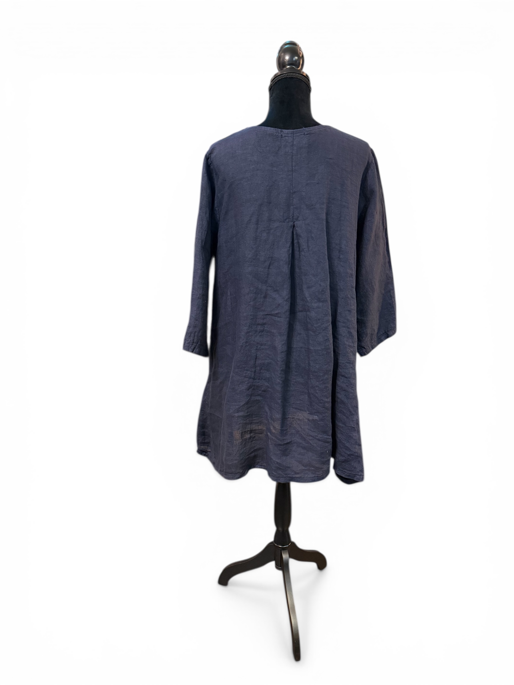 Linnetunika med rund halsringning, fickor och långa ärmar.