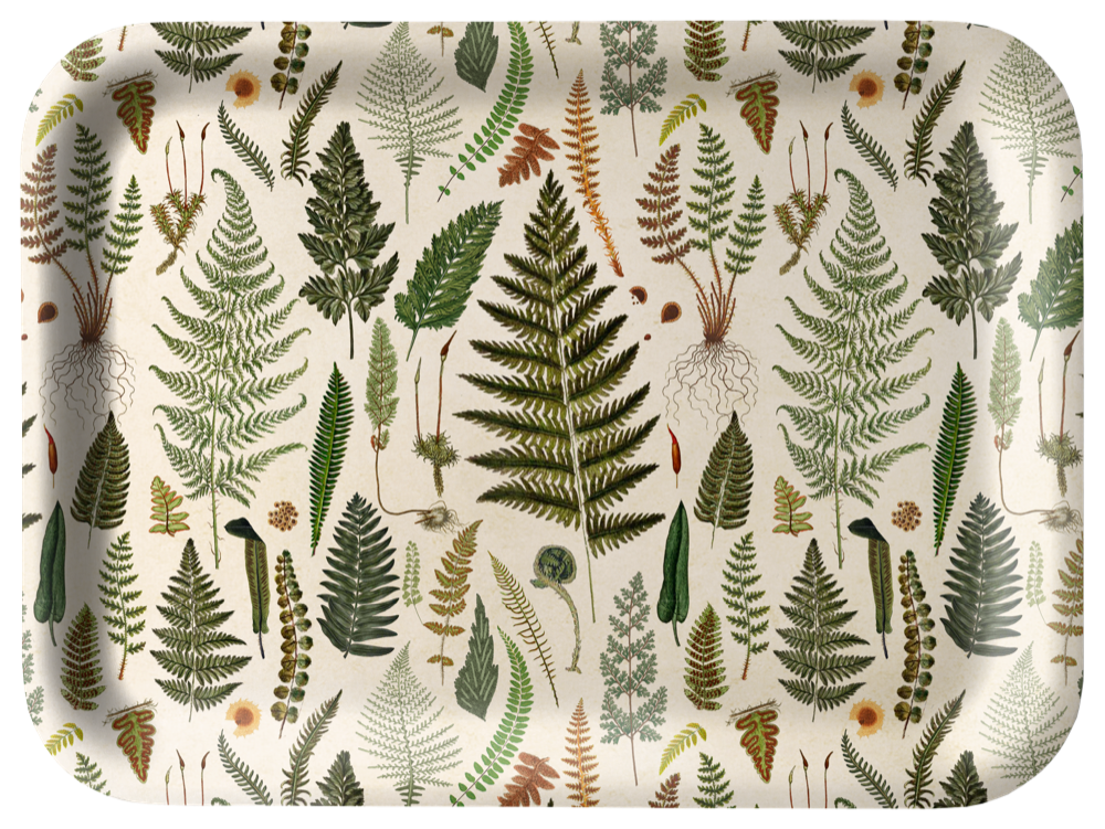Liten bricka i björkfanér med ormbunkar.